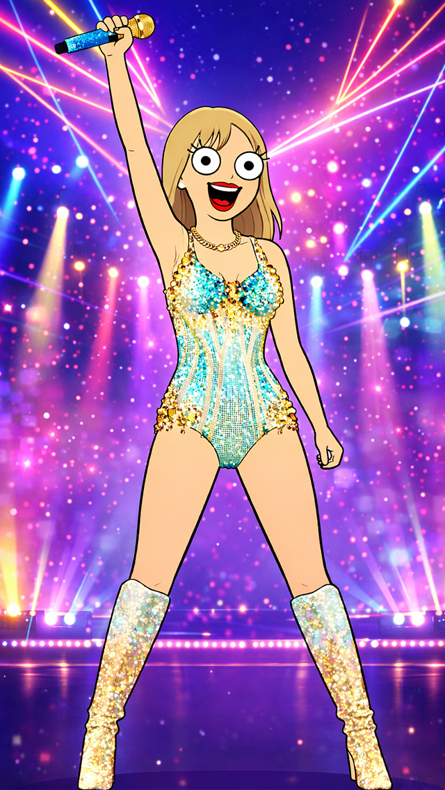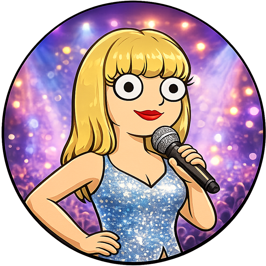 Taylur Swyftt is the ultimate pop-icon parody reborn in chaotic sparkle form. Inspired by a cartoon diva with big eyes, bold lips, and a mic that never rests, she sings through memes, drama, and love rumors.